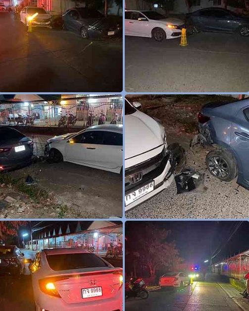 เจ้าหน้าที่ตำรวจเวรสอบสวน พร้อมผู้ช่วยพนักงานสอบสวน ออกตรวจที่เกิดเหตุ รถยนต์เฉี่ยวชนกันที่หมู่บ้านลักษณาวดี